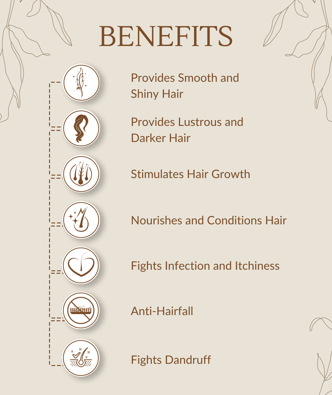 Bringraj It promotes hair growth, reduces greying and balding and makes the hair naturally darker. It also keeps the hair lustrous and healthy.