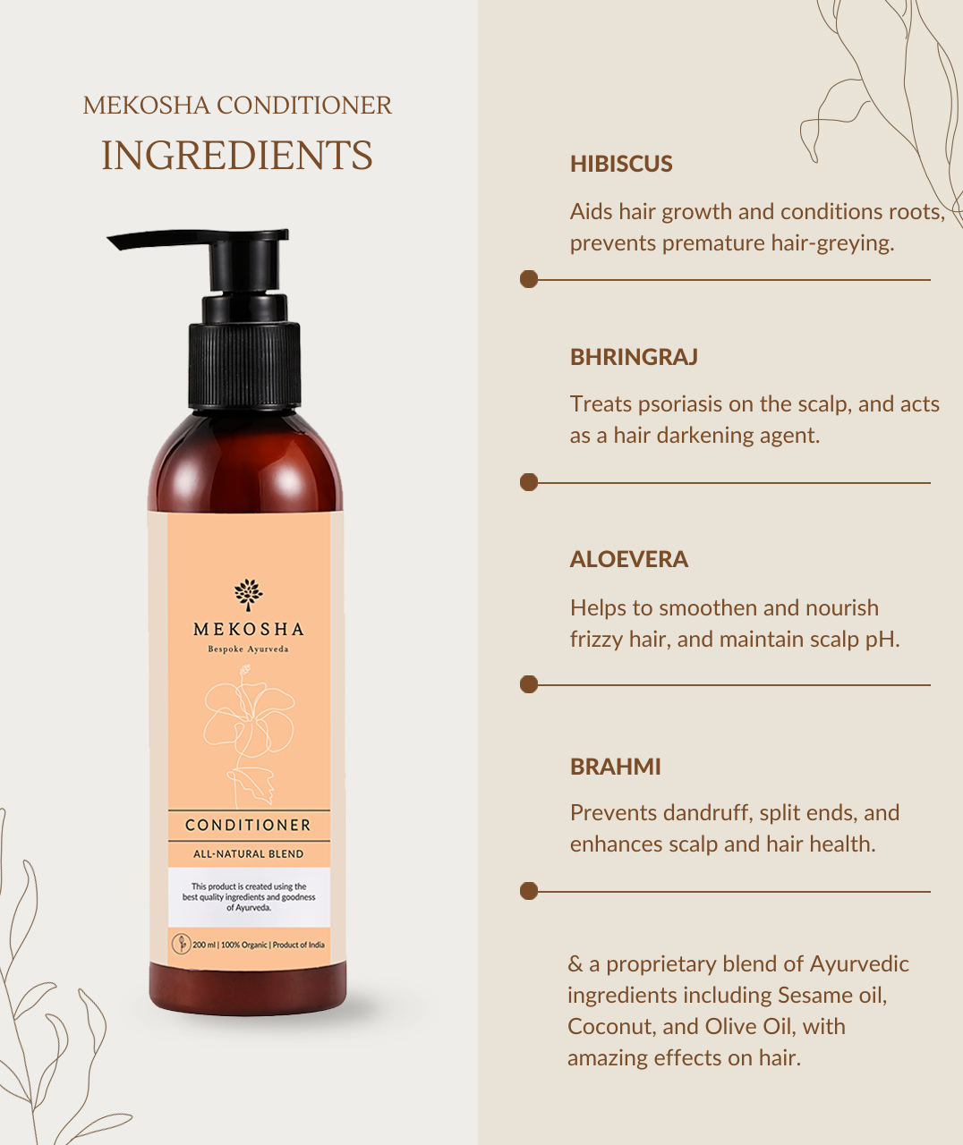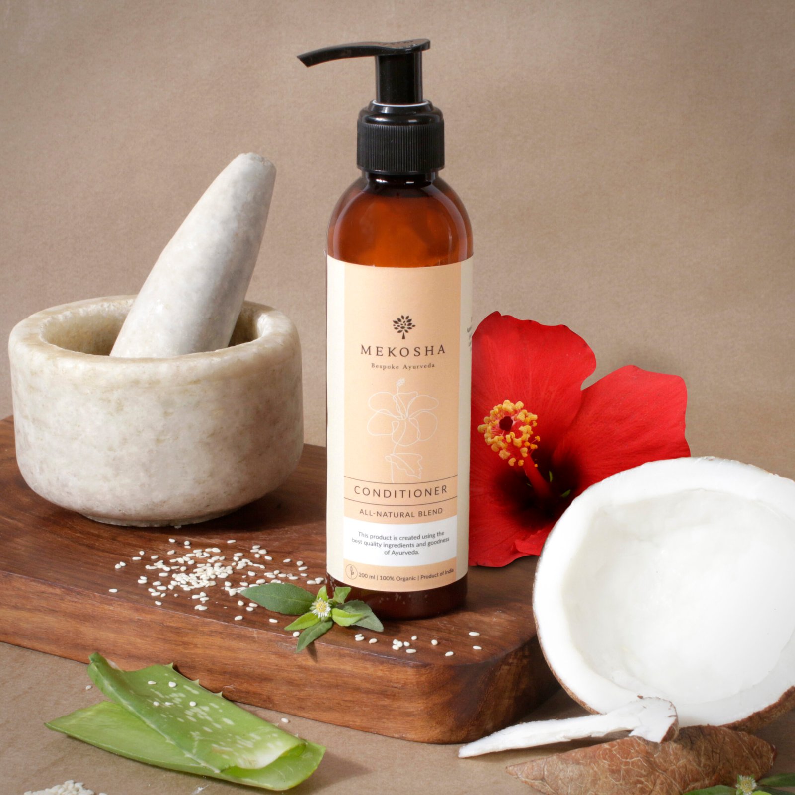 Started in the laps of Kerala, Mekosha Ayurveda Retreat brings to you “Mekosha Conditioner”, a pure & herbal Ayurvedic preparation that contains our specialized blend of Hibiscus, Bhringraj, Aloe Vera, and Sesame oil. For nourishing and stimulating hair growth, smooth, lustruous and shiny hair, helps fight against infection and itchiness, and anti-dandruff.