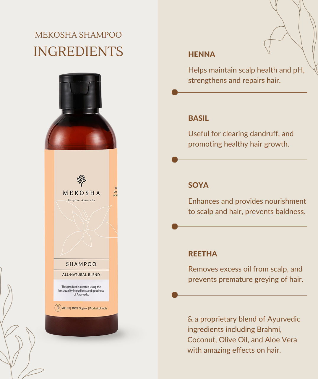 Started in the laps of Kerala, Mekosha Ayurveda Retreat brings to you “Mekosha Shampoo”, a pure & herbal Ayurvedic preparation that contains our specialized blend of Henna, Tulsi, Soya & Aloe vera. For long and strong hair.